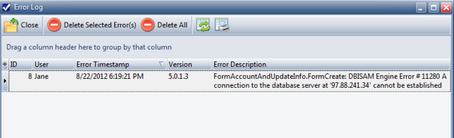 Use this utility to view past errors in the program. This might be useful when working with Tech Support to track down a problem. Unwanted records can be deleted by either clicking the Delete Selected Errors or the Delete All button.