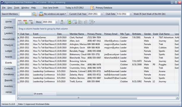 The Events Module provides a way to track the events members have participated in. Add, delete, view or modify records. Some popular events are provided by default. Customize additional event names under Admin > Generic Lookups > Events and associate awards with those events under Admin > Awards > Event Awards.